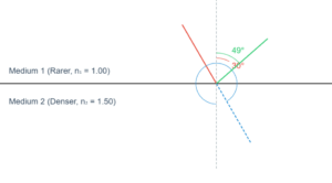Total Internal Reflection Simulation Total Internal Reflection Simulation Medium Properties Refractive Index (Medium 1 – Rarer): Value: 1.00 Refractive Index