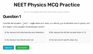 NEET Physics MCQ Quiz NEET Physics MCQ Practice Test your knowledge with these dimensional analysis questions Question 1 Consider the