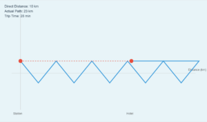 Taxi Speed vs Velocity Simulation Taxi Speed vs Velocity Simulation Direct Distance (km) 10 km Actual Path Distance (km) 23