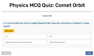 Physics MCQ Quiz – Comet Orbit Physics MCQ Quiz: Comet Orbit Score: 0/0 Previous Next