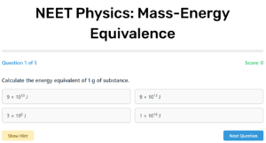 NEET Physics: Mass-Energy Equivalence NEET Physics: Mass-Energy Equivalence Question 1 of 5 Score: 0 Explanation: Show Hint Next Question Quiz